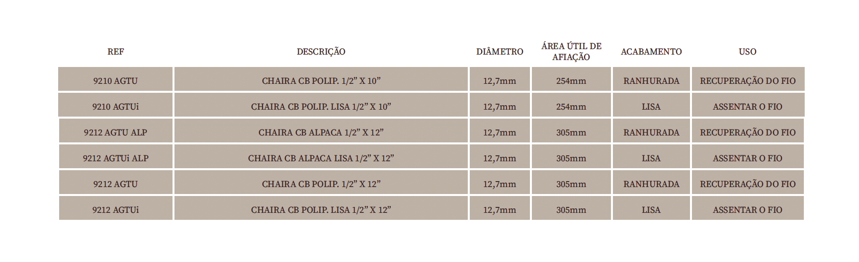 As chairas em Aço Prata Tungstenado recebem tratamento térmico indutivo e são revestidas com excelente camada de cromo duro, de 20 Microns. Chairas de 1/2” (12,70mm) de espessura e com dois comprimentos diferentes.