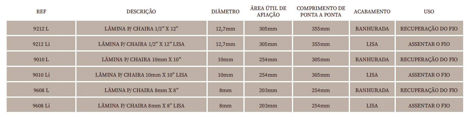 As lâminas em Aço Prata Tungstenado recebem tratamento térmico indutivo e são revestidas com excelente camada de cromo duro, de 20 Microns. Lâminas de 1/2” (12,70mm), 10mm e 8mm de espessura e com três comprimentos diferentes.