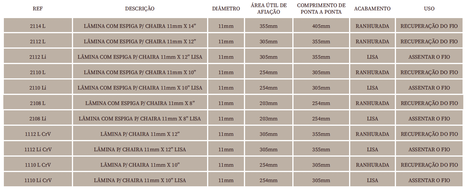 Nesta linha, trabalhamos com tipos diferenciados de acabamentos de lâminas: ranhuradas, lisas e dupla função.
